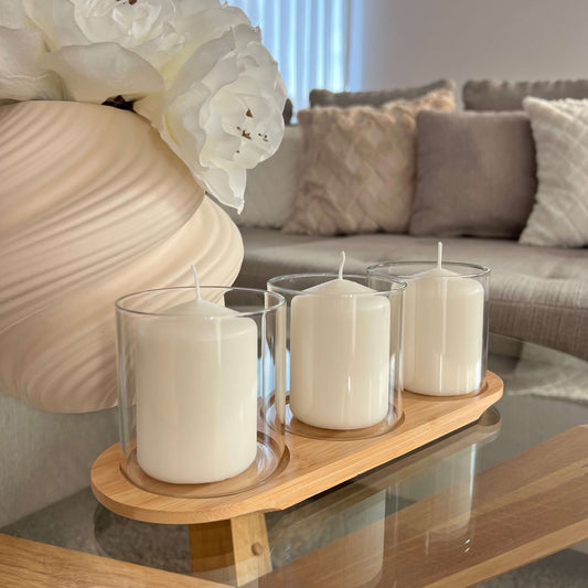 Kerzengläser auf Holztablett – 3-teiliges Set inkl. Kerzen